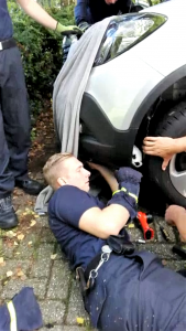 Am nächsten Morgen war klar, sie hatte das Auto als ihr neues „Heim auf Rädern“ auserkoren – ein Camper sozusagen. Vor Ort stellten die Mitarbeiterinnen der Tierherberge schnell fest, dass sie hier ohne Hilfe nicht weit kämen. Sie konnten den Hasen von oben – durch die offene Motorhaube schauend – zwar erkennen, aber sahen keine Chance dran zu kommen. Deshalb riefen sie bei der Feuerwehr Moers an und baten um Hilfe. Immerhin war mittlerweile bekannt wo „Hasi“ wohnt … in der Frontschürze des Autos. Ohne zögern erklärte man sich bei der Feuerwehr zur Hilfe bereit. Nachdem fast die gesamte Frontschütze auseinander gebaut worden war, erreichten die Männer die Kaninchen-Dame und konnten sie, ohne ihr auch nur ein Haar zu krümmen, aus ihrem Versteck holen. Gleich nach der Rettung mümmelte sie genüsslich an einer mitgebrachten Möhre.