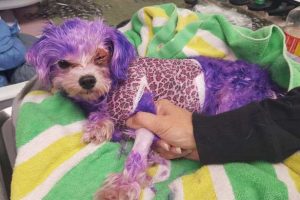 Violet wurde vor drei Monaten eingeliefert, weil sie starke Schmerzen hatte. Ihre Augen waren geschwollen, sie war schwach und apathisch, ihre Haut war verbrannt. Alles nur, weil irgendwer das Tier mit einem für Menschen geeigneten Haarfärbemittel lila gefärbt hatte. Ein Albtraum für das hilflose Tier. Die Tierärzte gaben Violet Schmerzmittel, wuschen die chemischen Substanzen ab und verbanden sie. Auf Facebook schreibt das Tierheim “Pinellas County Animal Services” aus dem US-Bundestaat Florida zu den Fotos des Tieres : “Bitte nutzt keine Haarfärbemittel für Menschen, um eurem Tier einen neuen Look zu verpassen. Und zwar unter keinen Umständen.”