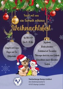 Außerdem gibt es Kinderschminken für die kleinen Besucher und einen Trödelstand mit Tierzubehör. Zudem lockt eine Tombola und ein Wunschbaum der tierischen Bewohner steht bereit. Natürlich ist auch für das leibliche Wohl gesorgt: Waffeln, Crêpes, Kaffee und Tee sowie Kaltgetränke erwarten die Besucherinnen und Besucher. Das Weihnachtsfest beginnt um 11.00 Uhr am Sonntagvormittag und endet um etwa 15.00 Uhr. Das BDT-Team hofft auf viele Besucher in der BDT-Tierherberge Am Drehmannshof 2 in Kamp-Lintfort.
